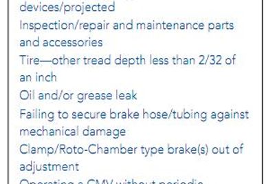 CSA incorporates all safety-related violations recorded in roadside inspections. So far in 2011, there have been 2,318,304 inspections and 4,511,539 violations. Top violations include inoperative required lamps, defective lighting, tire tread depth less than 2/32 inches and oil and/or grease leaks.