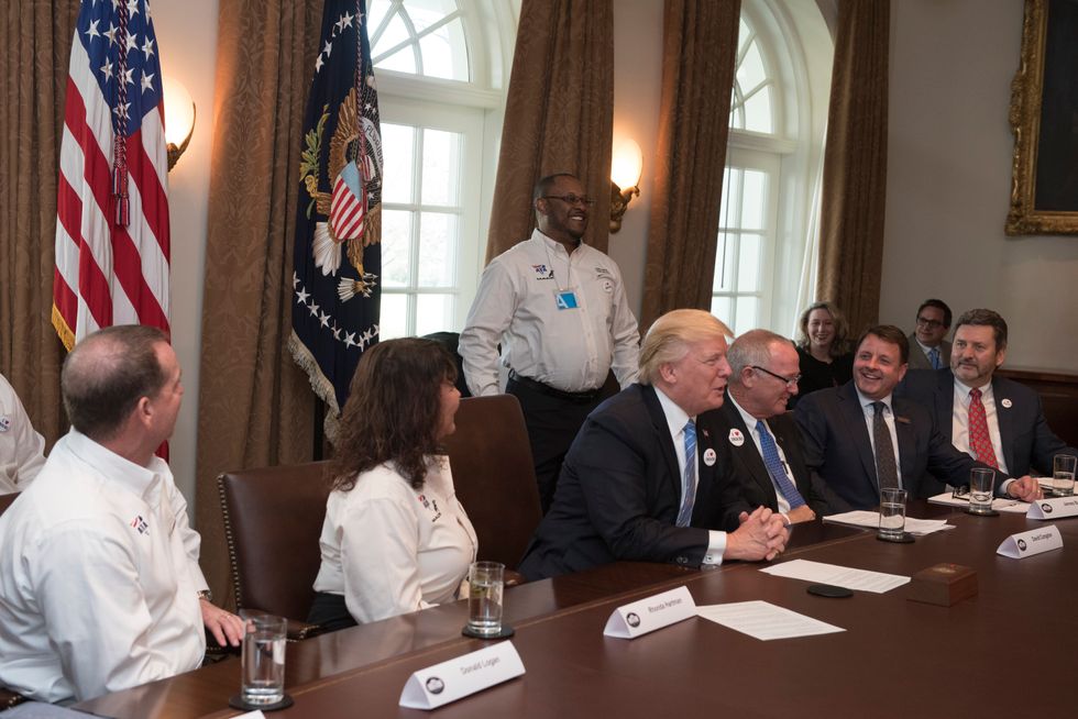 Penske Logistics truck driver Earl Taylor (standing) speaks during a visit to the White House as President Donald Trump (seated center) listens.